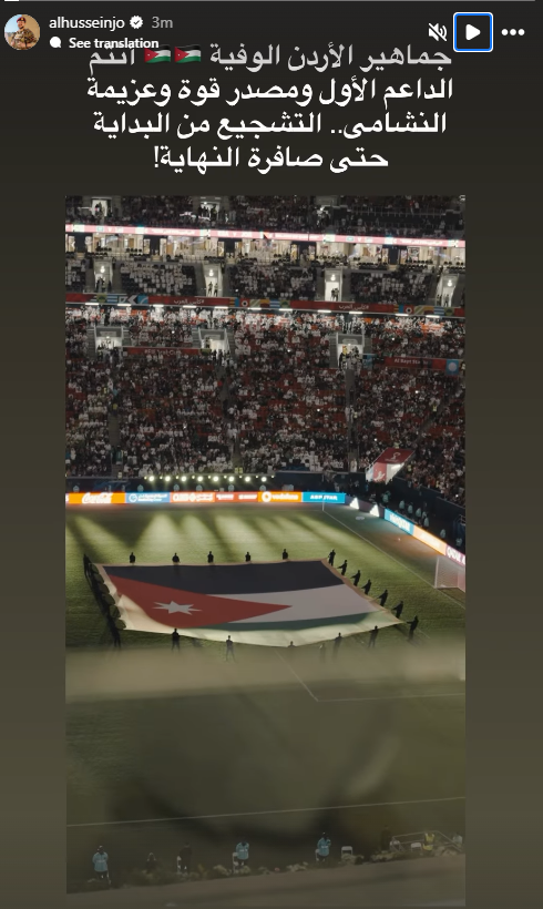 وكتب سمو ولي العهد عبر خاصية الستوري في منصة انستقرام” جماهير الأردن الوفية أنتم الداعم الاول ومصدر قوة وعزيمة للنشامى.. التشجيع من البداية حتى صافرة النهاية”.