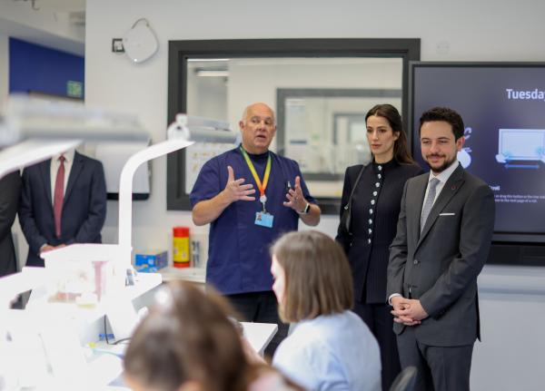 وجال سمو ولي العهد وسمو الأميرة رجوة في مرافق الكلية التقنية، واستمعا إلى شرح حول أساليب التدريس والتدريب التقني فيها.