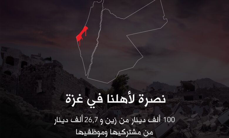 ضمن مبادراتها المستمرة تجاه الأهل في قطاع غزة منذ بدء العدوان الأخير، في إطار الهبّة الأردنية لنصرتهم في وجه الاحتلال واعتداءاته المستمرة والحصار المفروض عليهم منذ أسابيع؛ قدّمت شركة زين الأردن تبرّعاً نقدياً بقيمة 100 ألف دينار أردني، فيما قدم مشتركوها 9,024 دينار، بالإضافة إلى 17,700 دينار من موظفي الشركة، لإغاثة الأهل في قطاع غزة وإرسال المساعدات الإنسانية العاجلة وشراء الأدوية والمستلزمات الطبية للمستشفيات الفلسطينية والمواد الغذائية، بالتعاون مع الهيئة الخيرية الأردنية الهاشمية.