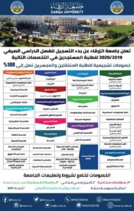 أعلنت جامعة الزرقاء عن فتح باب التسجيل للفصل الدراسي الصيفي 2019/2020 للطلبة المستجدين أو المنتقلين أو المجسرين، اعتبارا من الأحد 19/4/2020 ضمن التخصصات التي تطرحها الجامعة، وبخصومات تشجيعية تصل إلى 100%.