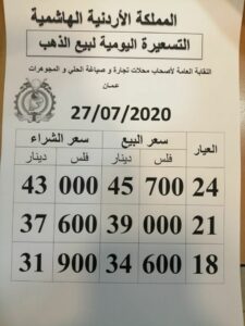 وبحسب النقابة العامة لأصحاب محلات تجارة وصياغة الحلي والمجوهرات فقد بلغ سعر الغرام من الذهب عيار 21 ما قيمته 39 ديناراً.