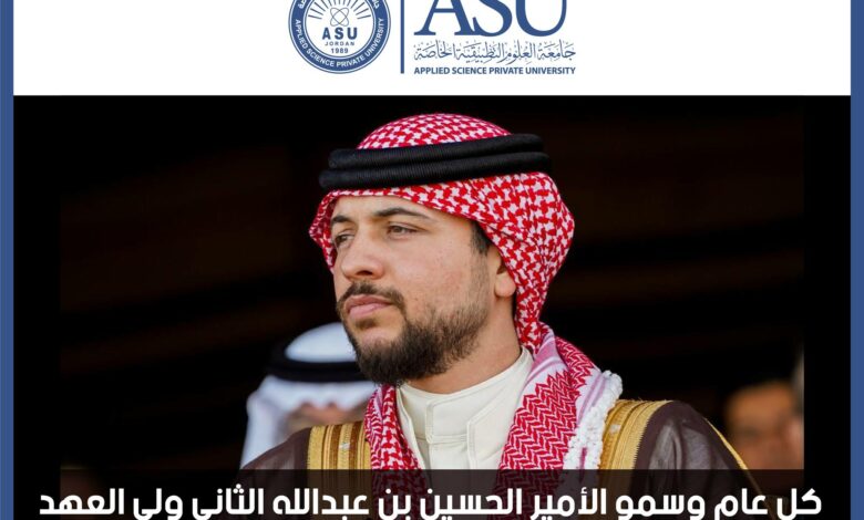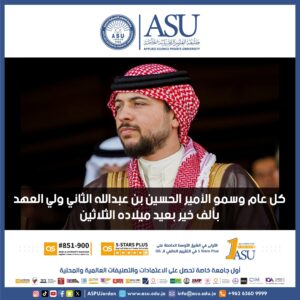 تتقدم جامعة العلوم التطبيقية الخاصة إلى مقام صاحب السمو الملكي الأمير الحسين بن عبدالله ولي العهد بأسمى آيات التهنئة والتبريك بمناسبة عيد ميلاده الثلاثين.