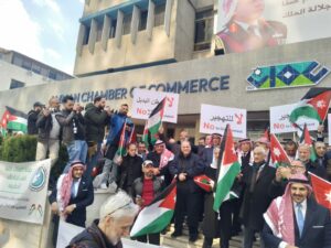 نظمت غرفة تجارة عمان، اليوم الثلاثاء، وقفة احتجاجية أمام مبنى الغرفة، رفضًا لتصريحات الرئيس الأمريكي السابق دونالد ترامب بشأن تهجير الفلسطينيين من قطاع غزة.