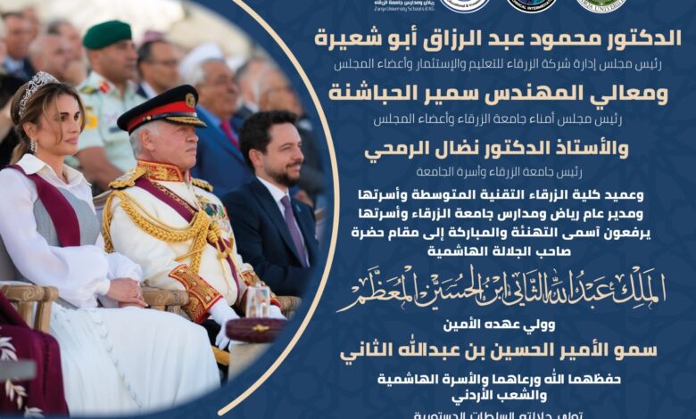 شركة الزرقاء للتعليم والاستثمار تهنىء بمناسبة تولي الملك سلطاته الدستورية